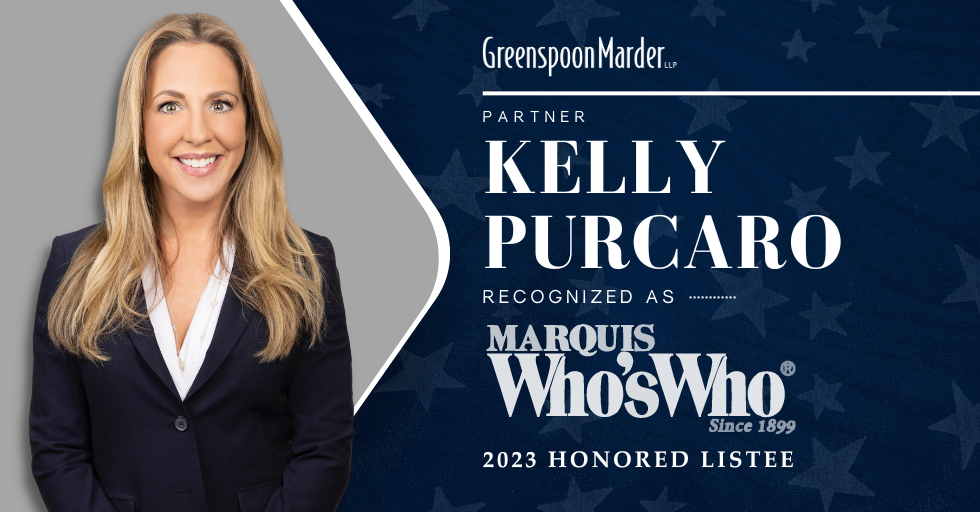 Newark, N.J. – December 8, 2023 – Based on her personal and professional background, Greenspoon Marder partner Kelly Purcaro has been recognized as a 2023 Honored Listee by Marquis Who’s Who in America. As in all Marquis Who’s Who biographical volumes, individuals profiled are chosen from among a pool of the most prominent professionals and are selected based on current reference value. Factors such as position, noteworthy accomplishments, visibility, and prominence in a field are all taken into account during the selection process.
