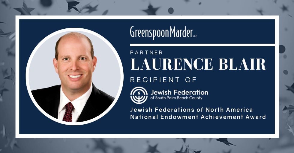 Boca Raton, Fla. – March 7, 2023 – Greenspoon Marder partner Laurence “Larry” I. Blair will be the recipient of the Jewish Federations of North America (JFNA) National Endowment Achievement Award, presented by the Jewish Federation of South Palm Beach County (JFSPBC). The Endowment Achievement Award honors a member of the community who, through leadership, vision, and dedication, has been instrumental to the successful growth of the Federation or Foundation’s endowment program. This annual award provides each community with an opportunity to recognize and thank their distinguished lay leader both locally and nationally. In addition to honoring the lay leader, the award also reflects the achievements of the endowment program over the past year. Mr. Blair will be honored during the JFSPBC’s 2023 Annual Meeting being held on Wednesday, March 29.