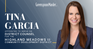 Orlando, Fla. – February 15, 2023 – Greenspoon Marder partner Tina Garcia has recently been appointed to serve as District Counsel for the Highland Meadows II Community Development District in Polk County, Florida. As District Counsel, Ms. Garcia will advise the district in the areas of public finance, public procurement, open government, public records, and ethics.