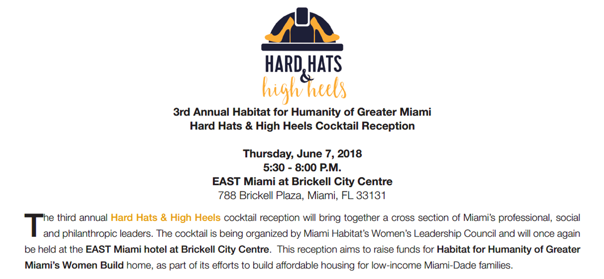 Hard Hats & High Heels Cocktail Reception Benefitting Habitat for Humanity of Greater Miami, June 7th