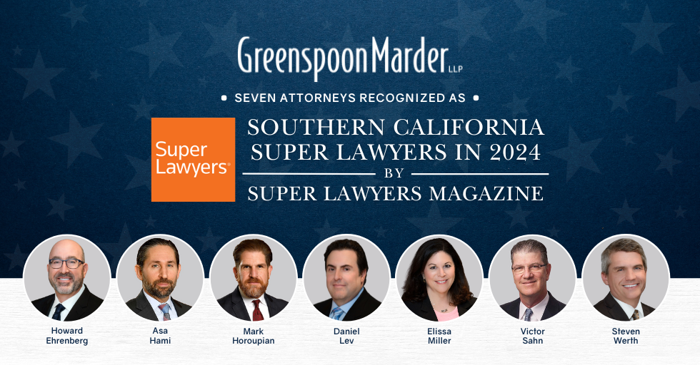 Los Angeles – January 11, 2024 – Greenspoon Marder California attorneys Victor A. Sahn, Elissa D. Miller, Howard M. Ehrenberg, Mark S. Horoupian, Daniel A. Lev, Asa S. Hami, and Steven F. Werth have been recognized as Southern California Super Lawyers in 2024 by Super Lawyers Magazine. Mr. Sahn and Ms. Miller first ranked as Super Lawyers dating back to 2006, while Mr. Ehrenberg has been ranked consecutively since 2004. Mr. Lev has also been recognized as a Super Lawyer consecutively dating back to 2011, while Mr. Horoupian has been recognized every year since 2004 with the first five years being named a Rising Star. Mr. Hami has been ranked repeatedly in the last three years, dating back to 2022 while Mr. Werth has been ranked two years in a row since 2023.