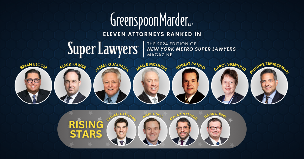 New York – October 24, 2024 – Greenspoon Marder announces seven partners have been listed as “New York – Metro Super Lawyers” in the 2024 edition of New York Super Lawyers Magazine. In addition, four attorneys have been recognized as a “Rising Star” by the publication.