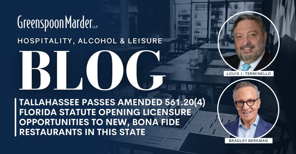 After intense debate by those with competing goals, the Florida Legislature sent a bill to the governor amending Florida Statute 561.20(4), the statutory section authorizing alcoholic beverage sales by restaurants in this state. The firm is proud to have been an integral part of the process. Known as the Special Food Service license, or SFS, this license is issued to restaurants that meet a list of specific criteria and comes with a reasonable annual fee imposed by the state. Prior to the passage of the recent bill, as a comparison, the criteria for acquiring and maintaining an SFS included, inter alia: